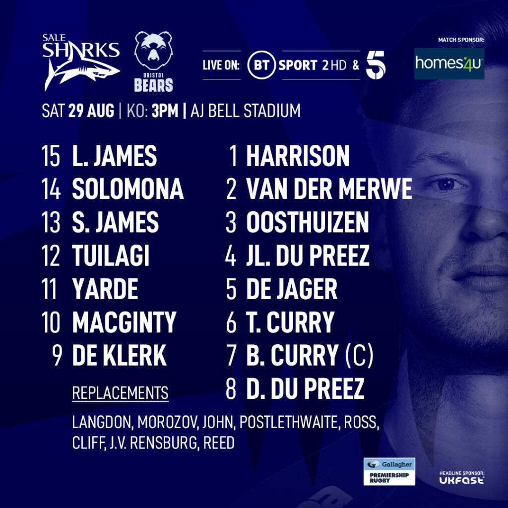 The Sharks’ all Springbok second row partnership of Lood De Jager and Jean-Luc du Preez will return to the starting line-up on Saturday afternoon, Du Preez’s twin brother Daniel returns after dropping out prior to the Wasps match with a bout of sickness. The 25-year-old South African international take’s his place at number 8 is joined in a mouth-watering back row by Ben and Tom Curry at blind and openside respectively. Ben Curry will captain the side again this weekend.