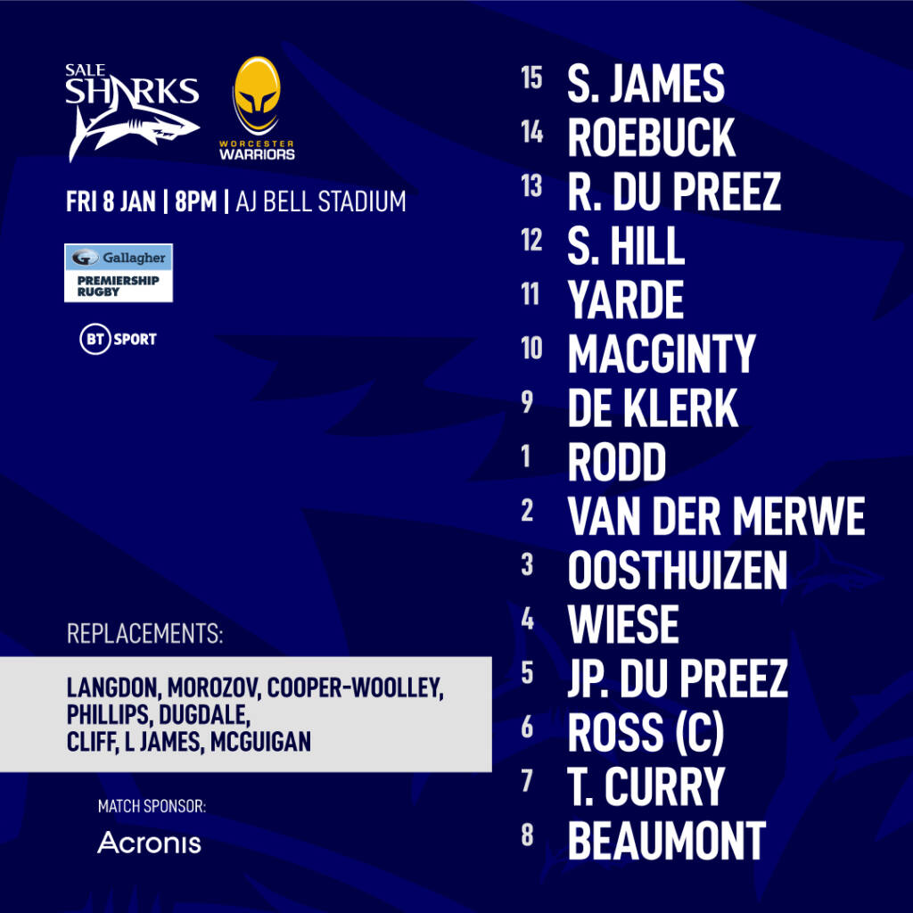 Sale Sharks have named their squad as they prepare to host Worcester Warriors at the AJ Bell Stadium on Friday 8th January. Head Coach Paul Deacon makes just one change his matchday squad as Josh Beaumont returns at number 8 to make his first start for the Sharks after fourteen months on the sidelines.
