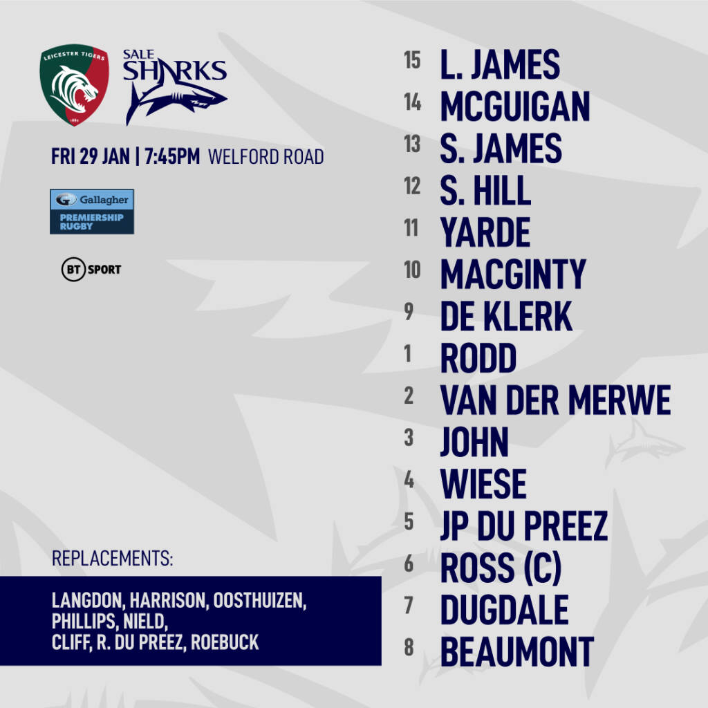 Sam James will make his 150th Sale appearance as the Sharks travel to Mattioli Woods Welford Road on the hunt of a fourth successive league victory over Leicester Tigers, as Alex Sanderson takes charge of his first fixture since joining the club. The newly appointed Director of Rugby names a strong matchday squad to face the Tigers as the Gallagher Premiership returns on Friday night. (Kick-Off 7:45pm – Live on BT Sport 1 Extra)