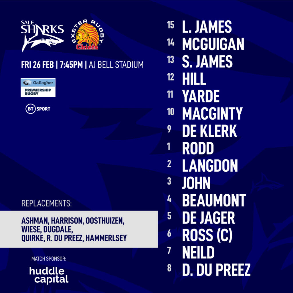 Faf de Klerk and AJ MacGinty make their first starts for Sale since the Sharks victory over the high-flying Bristol Bears on the 5th February. The mercurial pair have the power and precision of Sam Hill and Sam James at their disposal in midfield with Byron McGuigan, Marland Yarde and Luke James completing the Sharks XV in the back three.