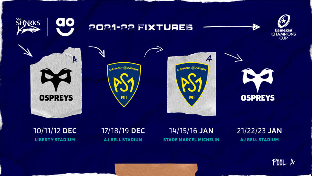 Sale Sharks can today confirm the arrangement of their Heineken Champions Cup fixtures ahead of the 2021-22 season. The Sharks face United Rugby Championship side Ospreys and the Top 14’s Clemont Auvergne this year in Europe’s Premiere competition.