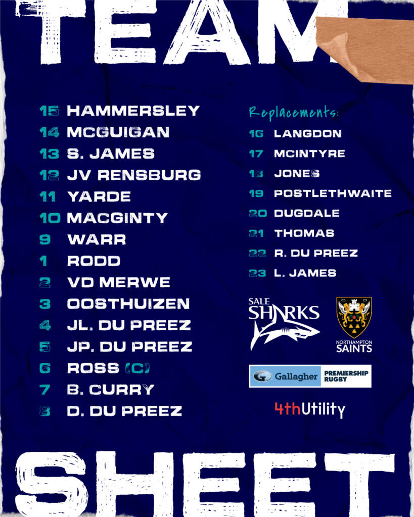 Jono Ross returns to captain the side after appearing as a replacement last weekend. The Sharks skipper is joined by Ben Curry and Daniel du Preez in the Sale back row.