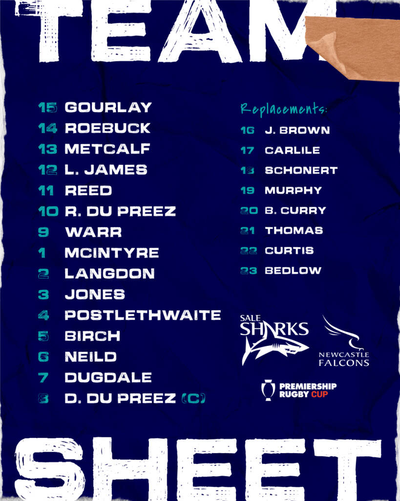 Sale Sharks have named their side to face Newcastle Falcons on Friday night as they look to continue the defence of their Premiership Rugby Cup title in front of a home crowd at the AJ Bell Stadium. Alex Sanderson makes seven changes to the starting team that faced Leicester Tigers in round one of the competition – and includes academy back Elliot Gourlay in his squad for the first time – as the Sharks look to bounce back from defeat against their northern rivals.