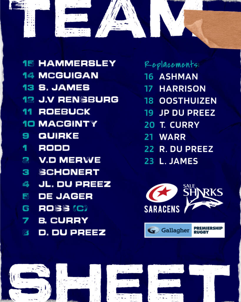 Jono Ross returns to action to captain the Sharks from his usual position of blindside flanker. The Sale skipper joins the influential Ben Curry and abrasive Daniel du Preez in the back-row.
