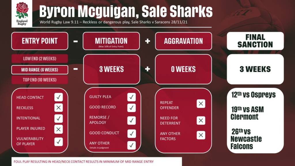 McGuigan accepted the charge and was given a three week suspension by the independent disciplinary panel comprising Samantha Hillas QC (chair) with Mitch Read and Tony Wheat. He is free to play again on 27 December 2021.