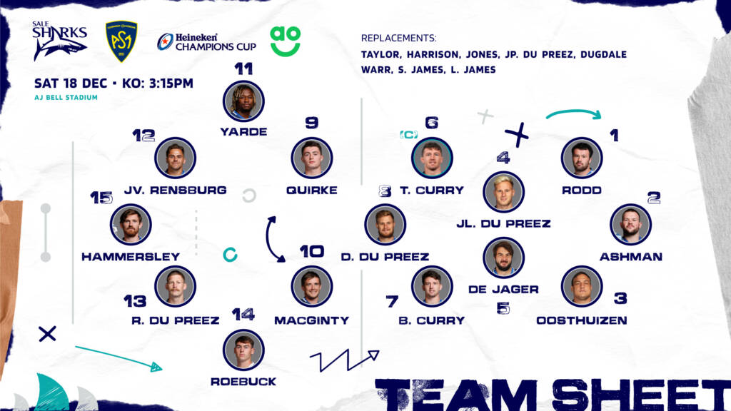 Tommy Taylor returns to action for the Sharks in Europe after suffering a shoulder injury during Sales Gallagher Premiership round six match with Leicester Tigers. The hooker acts as a front-row replacement alongside Ross Harrison and Joe Jones, whislt Jean-Pierre du Preez and Sam Dugdale offer further cover for the forwards.