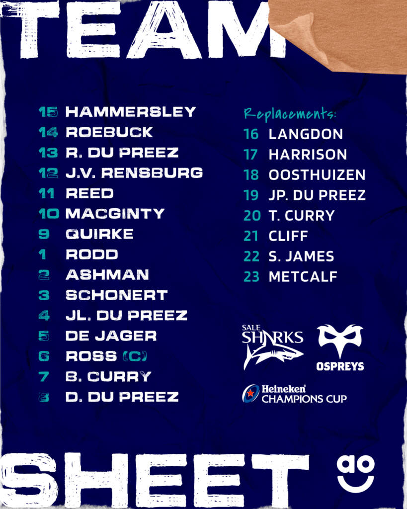 Mercurial England scrum-half Raffi Quirke returns after injury to line up alongside AJ MacGinty at half-back. The pair will make their first appearance together since the last time Sale met Ospreys at the start of December last year and will be looking to impress on their final pool stage outing in the Champions Cup this weekend.