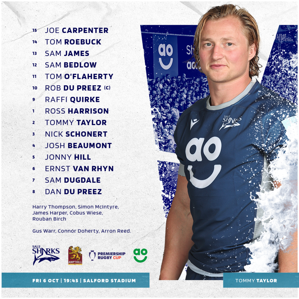 Hooker Tommy Taylor also starts at the Salford Stadium after injury along with Josh Beaumont and full-back Joe Carpenter as the Sharks gear up for the visit of Northampton Saints and the start of the Gallagher Premiership next week.