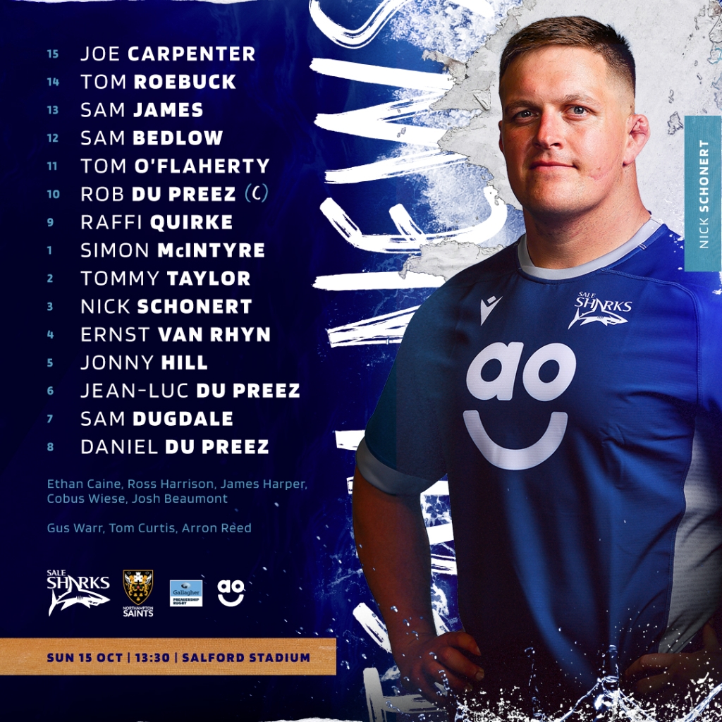 Rob du Preez is named as captain while new boy Ernst van Rhyn makes his league debut and Raffi Quirke gets the nod at scrum-half as Alex Sanderson picks his Sharks side to kick off the new Gallagher Premiership season against Northampton Saints (live on TNT Sports, KO 1.30pm, Sunday 15th October).