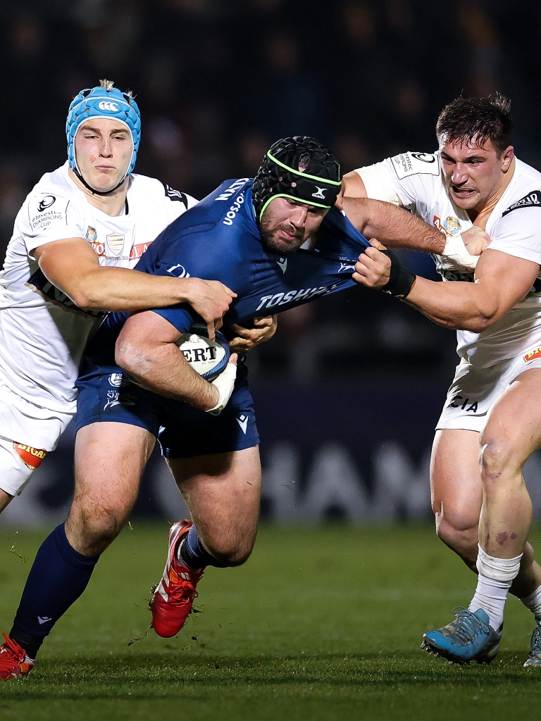 SALFORD, ENGLAND – DECEMBER 13: Bevan Rodd of Sale Sharks is tackled by Camille Chat and Maxime Baudonne of Racing 92 during the Investec Champions Cup match between Sale Sharks and Racing 92 at Salford Community Stadium on December 13, 2024 in Salford, England. (Photo by Jan Kruger/Getty Images for Sale Sharks)