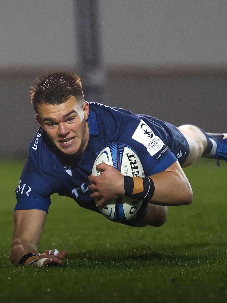 SALFORD, ENGLAND – DECEMBER 13: Joe Carpenter of Sale Sharks goes over for a try during the Investec Champions Cup match between Sale Sharks and Racing 92 at Salford Community Stadium on December 13, 2024 in Salford, England. (Photo by Jan Kruger/Getty Images for Sale Sharks)